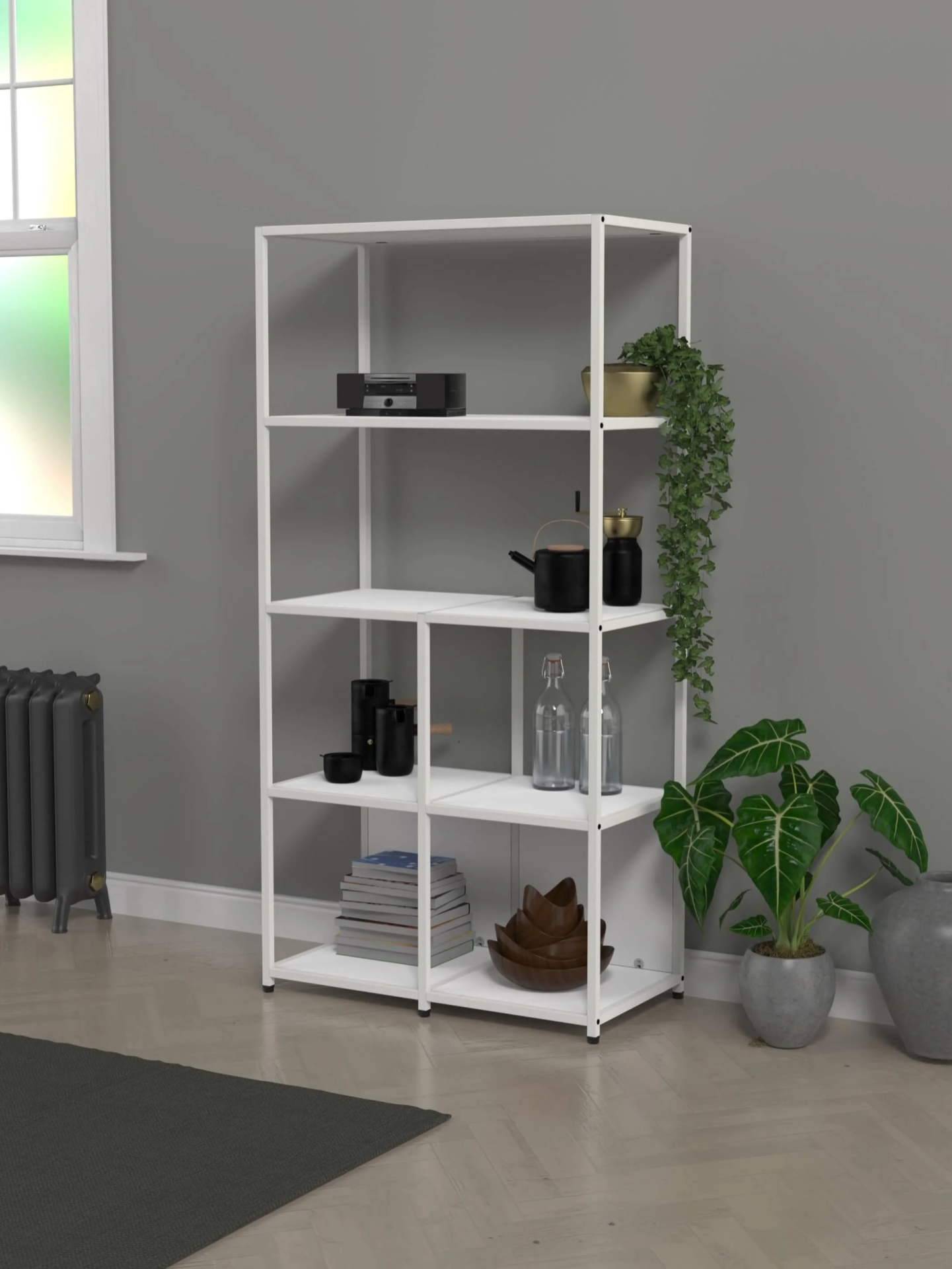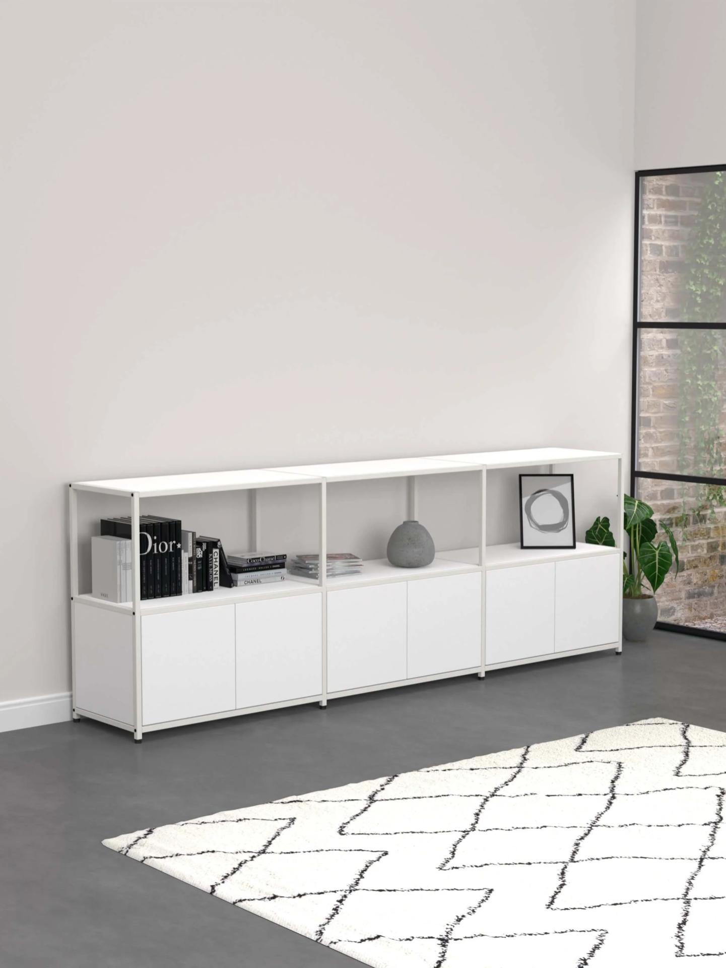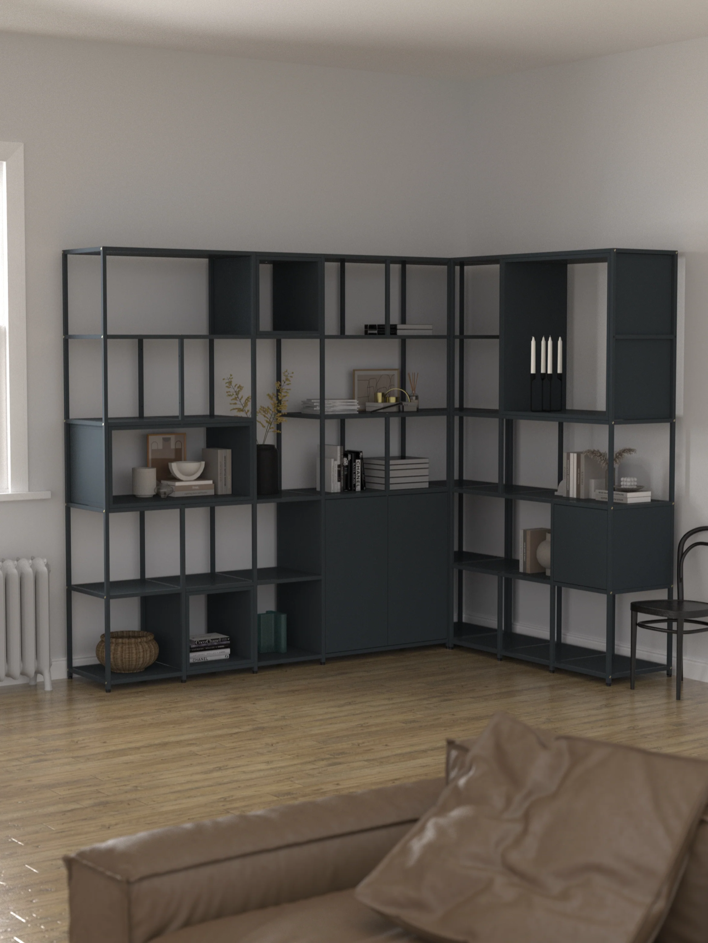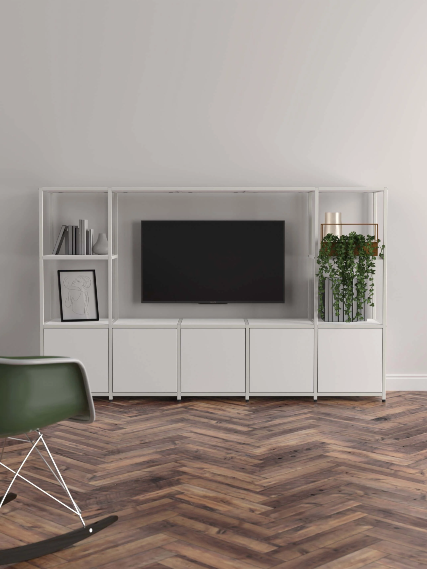 Mosaic Modular Shelving is built on a 40×40 cm grid, letting you create a sleek, space-saving solution tailored to your needs. From statement displays to cable-managed storage or office dividers, its compact footprint never compromises functionality.