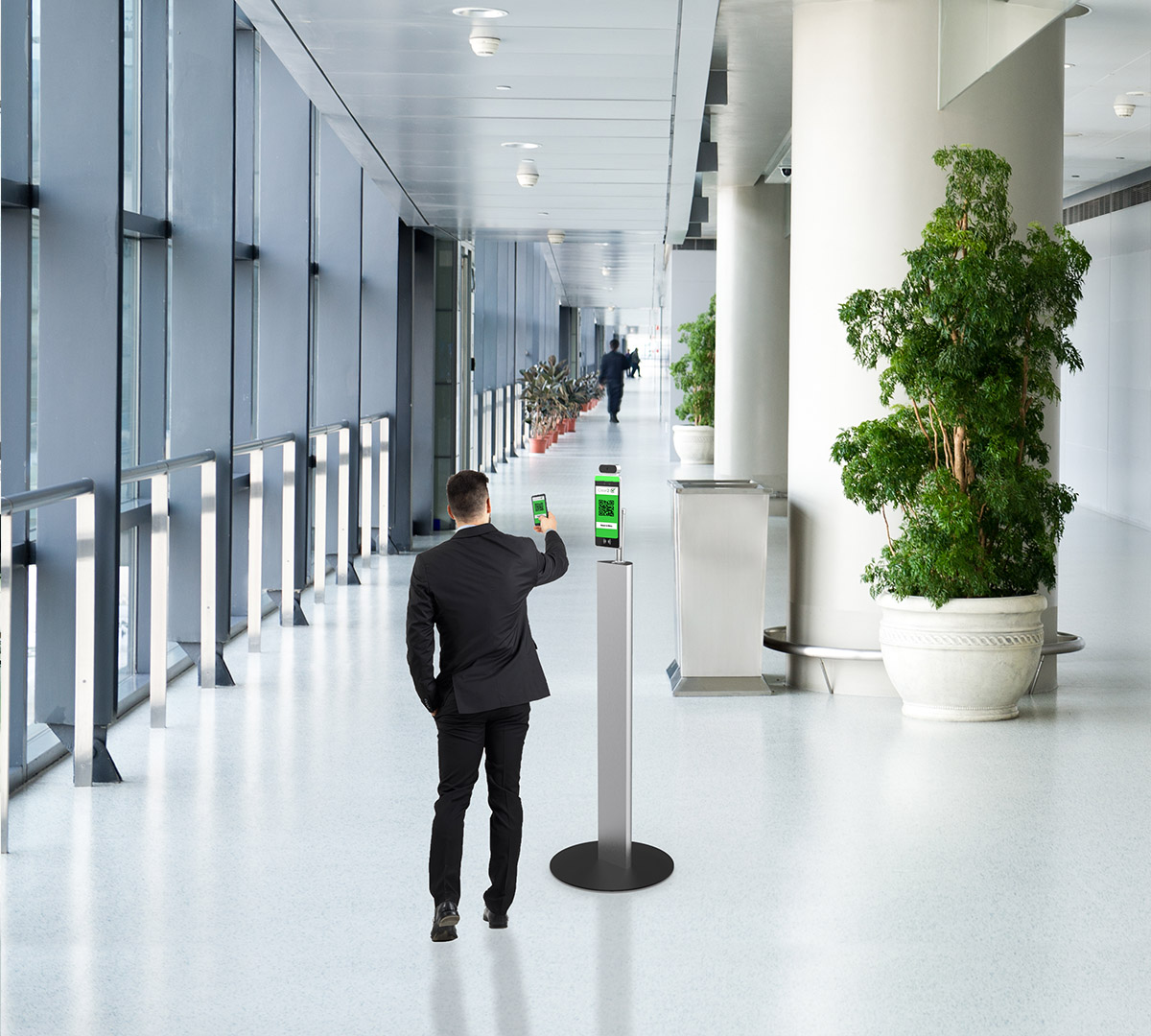 Using the hands-free thermal temperature scanning kiosk, temperature is verified, and a validation QR code is issued to either the employee or guest. This validation is required for entry into the location