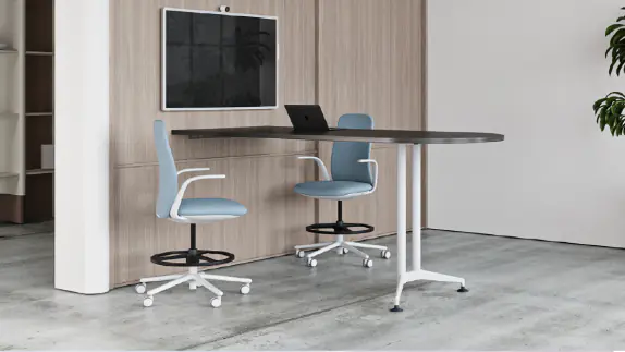 ZIA Media Tables combine the elegant leg design of the ZIA Collection, with several additional top shapes to help enhance your collaboration areas. The custom wall mount feature allows for effortless media integration.