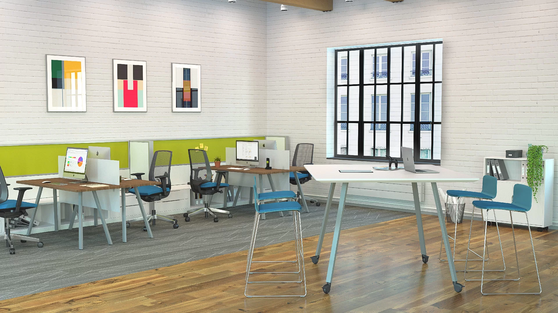 AIM table celebrates an attractive modern design suitable for a variety of interiors and delivers a high level of sophistication to any space. It bridges the gap between the traditional work spaces and a new generation of workers who are on the move throughout the day to focus on their work in a private setting, collaborate in groups, or connect in informal gathering areas. AIM supports the need for flexibility with three table heights, several shapes and sizes, premium casters, and versatile charging options.